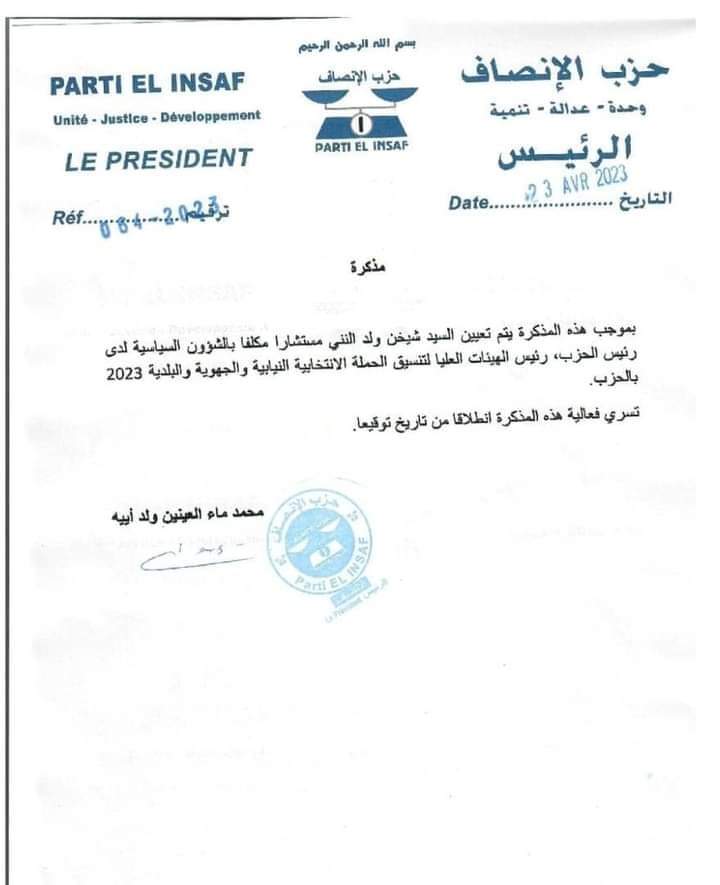 Insaf : Cheikhna Ould Nenni nommé conseiller politique pour la campagne électorale
